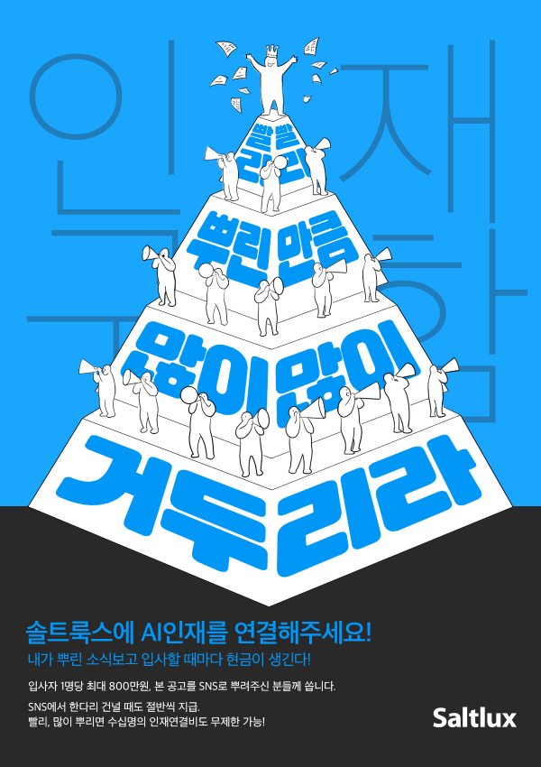솔트룩스는 이번 채용 소식을 알리는 일환으로 '솔트룩스 AI인재 연결 프로젝트’도 SNS에서 진행한다. 이벤트 게시물을 SNS에 공유 후 출처와 해시태그를 남기면 참여가 완료되며, 해당 게시물을 통해 최종 입사자가 발생할 경우 입사자 한 명 당 최대 800만원을 연결된 인원들에게 나눠 제공한다. 자세한 내용은 솔트룩스 홈페이지 및 공식 SNS에서 확인할 수 있다.