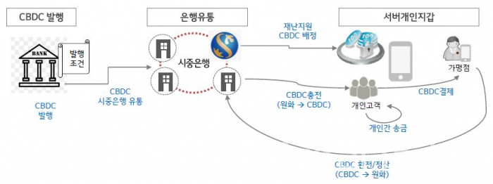 또 CBDC의 발행 형태를 개인이 보유한 원화 잔액에서 환전해 사용하는 일반자금과 특정 목적으로 정부 및 지자체에서 교부하는 재난지원금으로 구분하고 자금 별로 원장을 별도 관리할 수 있도록 했다. 또 재난지원금은 사용처를 한정하거나 사용 기한도 설정할 수 있도록 했다.