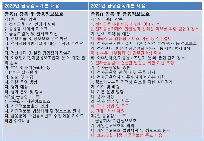 금감원은 금융감독개론에서 금융감독의 기존 방향성을 그대로 설명했지만 금융IT 부문에서 만큼은 큰 변화를 줬다. 핀테크 확산, 빅테크 등장, 금융회사들이 디지털 전환 등이 빠르게 추진되고 있는 상황을 반영한 것으로 보인다.