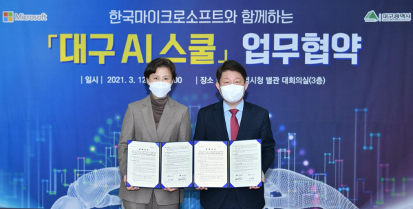 권영진 대구시장과 이지은 한국마이크로소프트 대표 등은 12일 오전 11시 대구시청 별관 대회의실에서 업무 협약을 체결, 오는 4월부터 ‘대구 AI 스쿨 사업’을 추진하기로 합의했다.