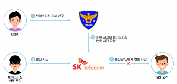 보이스피싱 번호차단 서비스는 경찰에 피해신고가 접수된 보이스피싱 번호를 서울경찰청이 SK텔레콤에 공유하면, SK텔레콤이 최근 개발한 보이스피싱 번호차단 시스템에서 해당 번호를 SK텔레콤 고객이 아예 전화를 받거나 걸 수 없도록 차단하는 프로세스이다. 보이스피싱 의심 전화를 받거나 낯선 문자메시지를 받은 후 경찰에 해당 번호를 신고하면, SK텔레콤과 경찰이 보이스피싱 번호를 확인해 전화를 차단하게 된다.