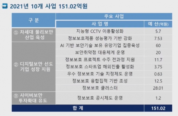 이를 위해 KISA는 올해 ▲차세대 물리보안 산업 육성 ▲디지털보안 선도 기업 성장 지원 ▲사이버보안 투자확대 유도 등 3가지 분야 총 11개 사업에 151억원을 투자할 계획이다. 이 중 'AI 기반 보안기술 보유 유망기업 집중 육성'사업에는 60억원이 투입되며, '정보보호 클러스터' 사업에는 28억원을 투입해 정보보호 산업 육성에 힘쓴다.