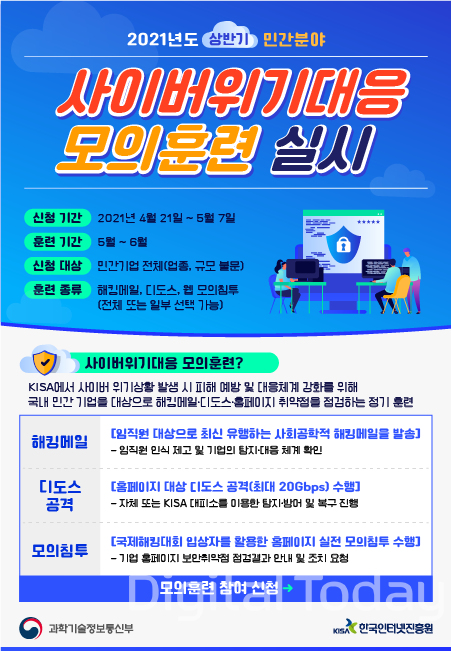 [디지털투데이 강진규 기자] 한국인터넷진흥원(KISA)은 사이버공격 발생시 신속한 대응 및 협조체계 점검을 위한 '2021년 상반기 민간 분야 사이버 위기대응 모의훈련' 참여기업을 공개 모집한다고 21일 밝혔다.