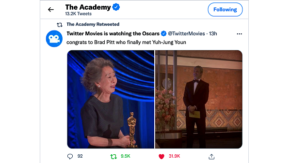또한 아카데미 시상식의 공식 트위터 계정(@TheAcademy)의 이번 수상 발표 트윗 중 이례적으로 여우조연상을 발표한 트윗이 현재 3만9천 건으로 가장 많은 리트윗을 기록한 것으로 확인됐다. 이 계정에서 현재까지 역대 가장 많이 리트윗된 최고의 트윗은 지난 해 영화 ‘기생충'의 작품상 수상을 알린 트윗으로 17만 건 이상 리트윗됐다.