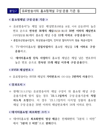 이 안대로라면 0번~30번 사이에 NS·롯데·CJ·GS·현대홈쇼핑 등은 30번까지 1개 채널만 넣을 수 있고, 신세계TV쇼핑·SK스토아·KTH 등은 15번 이후에 편성될 수 밖에 없다. 이에 유료방송사(IPTV·케이블TV·위성방송)나 홈쇼핑채널 등 업계는 정부가 유료방송사의 채널 편성권을 침해한다며 반발하는 상황이다. 이에 따라 정부가 ‘유료방송사-방송채널사용사업자(PP) 상생협의체’를 운영하는 것으로 풀이된다.