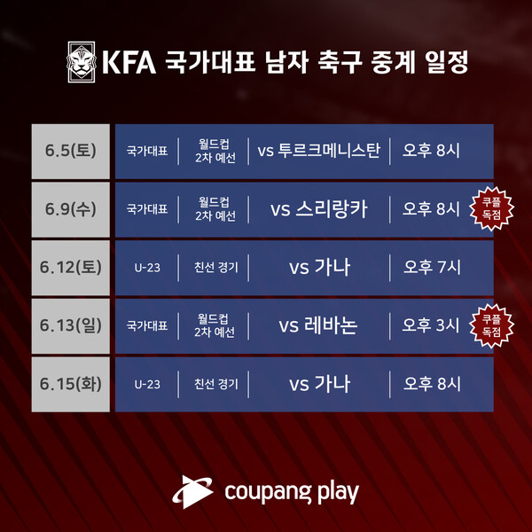 [디지털투데이 정유림 기자] 쿠팡의 온라인 동영상 스트리밍(OTT) 서비스 쿠팡플레이가 대한축구협회(KFA) 남자 축구 국가대표 경기를 생중계한다.