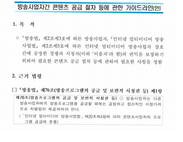 디지털투데이가 입수한 ‘방송사업자간 콘텐츠 공급 절차 등에 관한 가이드라인’은 ‘방송법 제2조제3호’에 따른 방송사업자, ‘인터넷 멀티미디어 방송 사업법’(IPTV 사업법) 제2조 제5호에 따른 인터넷멀티미디어 방송사업자 상호간에 공정한 경쟁과 시청자(이용자)의 권익을 보장하기 위해 필요한 콘텐츠 공급 절차 등에 관한 필요한 사항을 정했다.