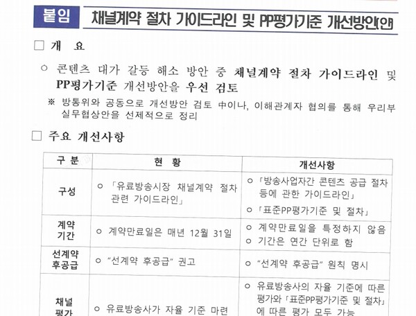 이전에는 계약 만료일을 매년 12월 31일로 했지만, 계약 만료일을 특정하지 않고 기간을 연간 단위로 하는 방안으로 바뀐다. 선계약 후공급 원칙을 명시하고, 채널 평가의 경우 기존의 유료방송사의 자율 기준에 따른 평가와 ‘표준PP평가기준 및 절차’에 따른 평가 모두 가능하도록 했다.