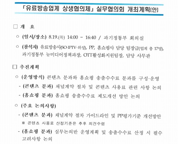 정부는 콘텐츠 분과와 홈쇼핑 송출수수료 분과를 구성 및 운영한다. 콘텐츠 분과는 ‘방송사업자간 콘텐츠 공급 절차 등에 관한 가이드라인’과 ‘표준PP평가기준 및 절차’(초안) 공개를 통해 관련 사항을 논의했고 콘텐츠 사용료 산정기준은 추후 의견 수렴하기로 했다. 홈쇼핑 분과는 실무논의반 운영계획 및 송출수수료 산정시 필수 고려사항을 논의했다. 정부는 8월 말 홈쇼핑 분과 전문가 TF 및 제2차 실무협의반을 필요시 운영하고, 9월 2주차에 허성욱 네트워크정책실장이 참여하는 ‘유료방송 상생협의체’를 개최할 예정이다. 이어 오는 10월 방송통신위원회와 공동으로 과기정통부는 콘텐츠 대가산정 공청회를 열 계획이다.