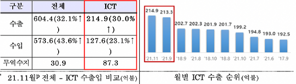 과학기술정보통신부는 11월 ICT 수출액이 214억9000만 달러(30%↑)를 기록, 지난 9월 이후 2개월 만에 최고 월 수출액을 경신했다고 14일 밝혔다. 증가율은 8개월 연속 두자리수를 나타냈다. 또한 역대 11월 수출액 중 1위이며, 11월 누적 기준 최고치를 기록했다.