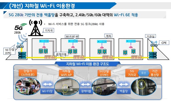 [세종=디지털투데이 백연식 기자] 내년부터 지하철 객차 안에서 기존 와이파이보다 최대 5배 빠른 와이파이 6E를 제대로 이용할 수 있게 된다. 정부와 이통3사는 28㎓ 5G 기반 와이파이를 지하철 2호선 성수지선에 구축한 바 있다.