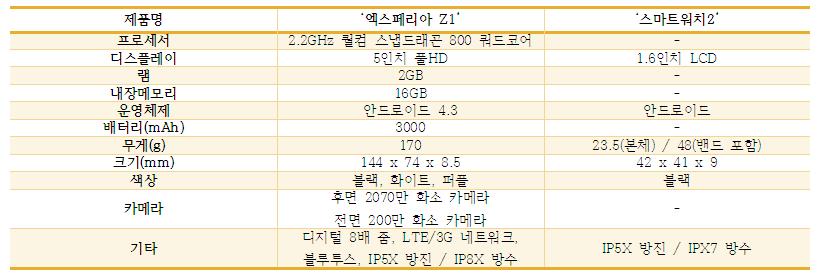 <표> 소니 '엑스페리아 Z1'와 '스마트워치2' 기본성능