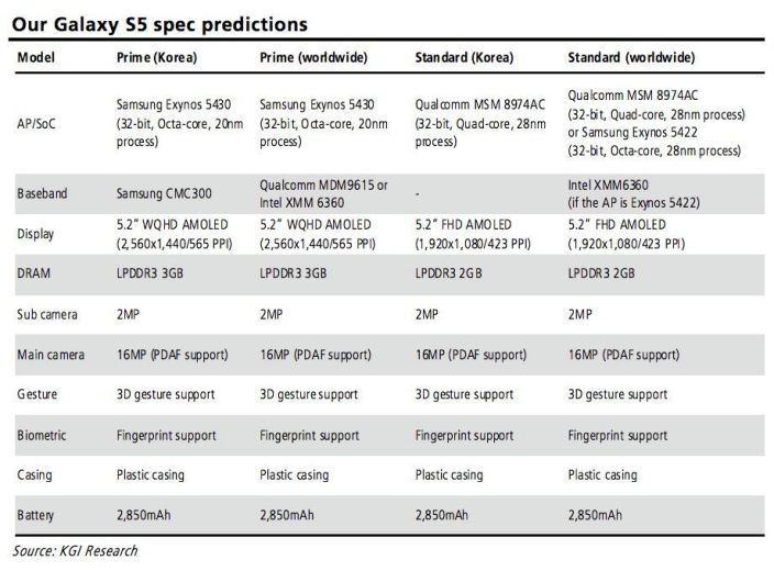 25일(현지시각) 나인투파이브맥(9to5Mac)에 따르면 시장조사업체 KGI리서치는 삼성 갤럭시S5의 사양을 예측한 문서를 공개했다. 이에 따르면 갤럭시S5는 표준 및 프라임 등 2가지 다른 모델로 출시된다.