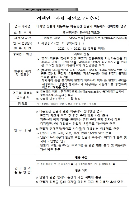 과기정통부 통신이용제도과 관계자는 “이동통신 단말기 이용제도 개선 관련 정책연구과제 공모는 이동통신 단말기 이용제도 개선 추진이 아니다. 정보통신정책연구원(KISDI) 등 대상 과제 공모로 연구 차원”이라고 말했다.