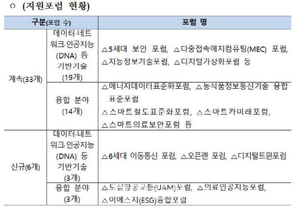 올해도 과기정통부는 ‘지능정보기술포럼’, ‘미래양자융합포럼’ 등 33개 표준화 포럼에 대한 지원을 이어간다. 또 ▲6세대(6G) 이동통신 포럼 ▲오픈랜포럼 ▲도심항공교통(UAM) 포럼 ▲의료인공지능포럼 ▲디지털트윈포럼 ▲환경·사회·지배구조(ESG) 융합포럼 등 6개 포럼을 신규 지원한다.