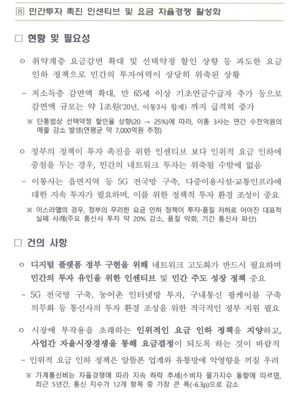 선택약정 할인 25% 상향에 따라 연간 수천억원의 매출 감소가 발생(연평균 약 7000억원 추정)한다고 주장했다. 이에 따라 정부의 정책이 투자 촉진을 위한 인센티브보다 인위적 요금 인하에 중점을 두는 경우 민간의 네트워크 투자는 위축된다는 얘기다.