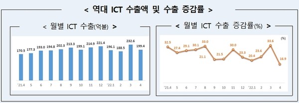과학기술정보통신부가 12일 발표한 ‘4월 ICT 수출입 동향’ 자료에 따르면 지난 달 ICT 수출은 전년 동월 170억5000만 달러 대비 16.9% 증가한 199억4000만 달러로 집계됐다. 역대 4월 수출액 중 가장 높은 규모다.
