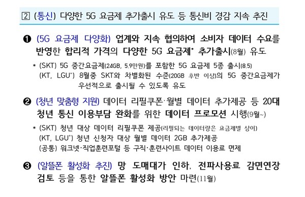 또 정부는 추석 통신비 경감 대책으로 20대 청년들의 통신 이용부담 완화를 위한 데이터 프로모션을 9월부터 시행한다고 밝혔다. 이에 따라 SK텔레콤은 데이터 리필쿠폰을, KT와 LG유플러스는 신청자에 한해 월별 데이터를 추가 제공(2GB)한다. 이통3사 공통으로 워크넷・직업훈련포털 등 구직・훈련사이트 이용 시 데이터 이용료를 면제한다.