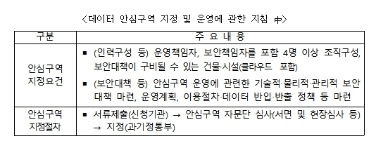 과기정통부는 올해 4월 시행된 ‘데이터산업법’ 및 같은 법 시행령에 근거를 마련한 이후, 지난 7월 ‘데이터 안심구역 지정 및 운영에 관한 지침’을 마련한 바 있다. 데이터 관련 기업 및 공공기관 등 데이터산업법에 따른 데이터안심구역을 운영하고자 하는 기관은 데이터안심구역 지정 신청서 등 지정 지침에 따른 관련 서류를 구비해 수시로 지정 신청(상시 접수)할 수 있다.