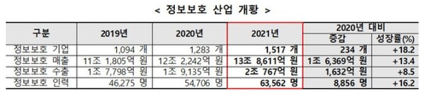 [디지털투데이 백연식 기자] 지난해 정보보호 산업 매출이 13조원을 넘어섰다. 관련 기업 수는 물론 인력 규모가 견고한 상승세를 보였고 수출액도 증가했다.