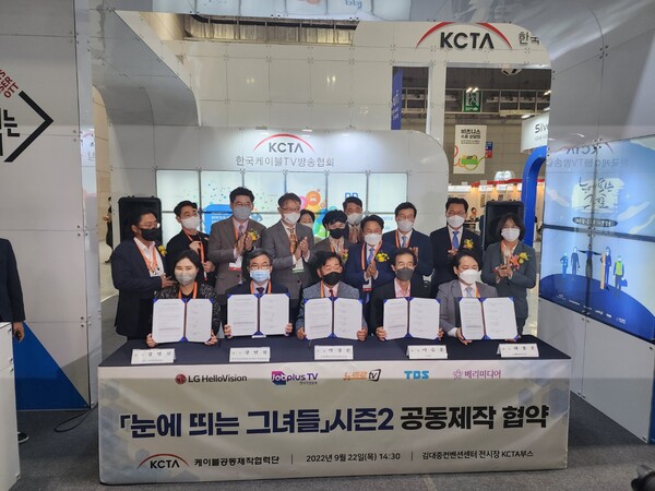 22일 광주 에이스페어 전시관에서는 LG헬로비전과 CMC가족오락TV, TBS, 직업방송, 베리미디어 등 5개사가 협약식을 갖고 ‘눈에 띄는 그녀들 시즌2’ 공동제작 참여를 선언했다.