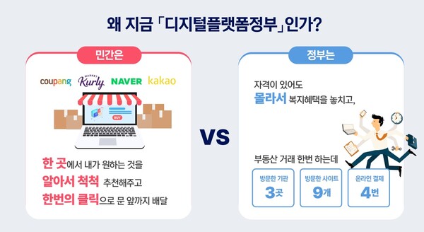 정부는 디지털플랫폼정부 구현을 통해 향후 국민은 몰라서 정부 혜택을 놓치는 일이 없도록 알아서 챙겨주는 맞춤형 서비스를 제공받고, 신청 과정에서 한 곳에 한 번만 관련 서류를 제출하는 등 보다 편리한 서비스를 이용할 것이라고 설명했다.