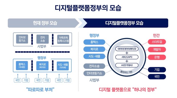 이어 “새로 지향하는 디지털플랫폼정부가 전자정부와 단적으로 다른 것은 개별 부처, 제공자인 정부 관점 또 그 서비스를 담당하는 개별 부처의 관점이 아니라, 개별 부처들이 운영하는 시스템이 아니라 부처들이 그런 사일로(Silo, 칸막이)식의 시스템 구축 방식에서 같이 협업하고 부처의 시스템과 데이터들이 연계될 수 있는 그런 새로운 공간, 새로운 장을 만든다는 취지”라고 부연 설명했다.
