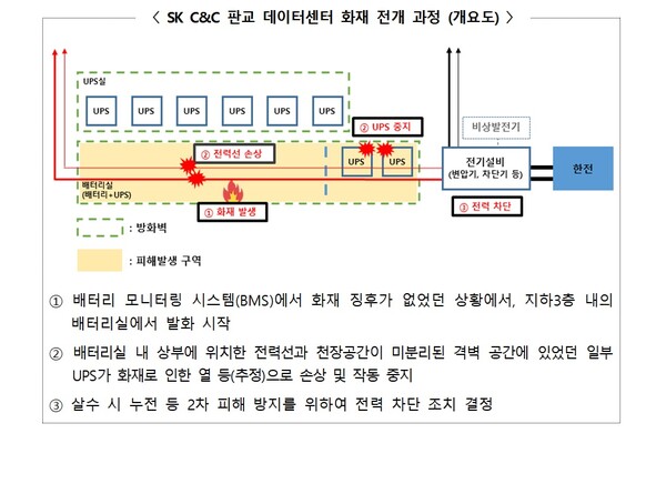 SK C&C 판교 데이터센터는 배터리 온도 등을 모니터링하는 시스템(BMS)를 갖추고 있었지만 제대로 운영되지 않았다. 발화로 인해 온도가 올라가면 BMS 센서가 달라진 온도를 인지하고 징후를 보여야 한다. 하지만 BMS가 화재 발생 직전까지 아무 이상 징후를 보이지 않았다. BMS가 화재를 감지하지 못하고 결국 지하 3층 내 배터리실에서 발화가 시작됐다.