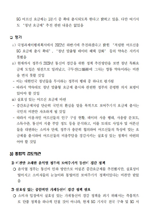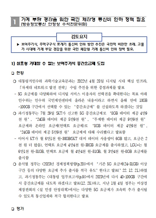 안 위원은 “윤석열 정부가 ‘2023년 경제정책방향’, 과학기술정보통신부의 ‘대통령 업무보고서’, 비상경제장관 회의 ‘설 민생 안정대책’ 등에서 다시 추가적인 중간요금제를 추진한다는 것은 이미 추진한 중간요금제 도입이 실패했다는 것을 자인하는 것”이라며 “결과적으로 일단 통신비를 인하한다는 구호를 외치고 국민의 환심만 사고 보자는 주먹구구식 정책이었다는 것을 확인시켜 주는 것”이라고 말했다.
