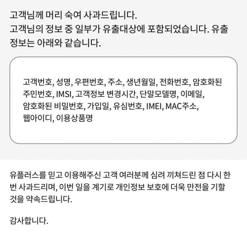 LG유플러스가 정보 유출 피해 고객에게 보낸 안내문에 따르면 성명, 생년월일, 전화번호 외에도 가입자 고유식별번호(IMSI), 단말기 고유식별번호(IMEI), 유심번호, 이메일, 가입일, 가입 상품명, 고객정보 변경 시간 등이 포함됐다.