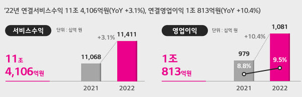 영업수익(매출)은 2021년에 비해 0.4% 늘었으며 영업수익에서 단말 수익을 제외한 서비스수익은 3.1% 상승했다. 특히 영업이익은 유무선 사업의 안정적인 성장에 힘 입어 전년 대비 10.4% 증가했다.