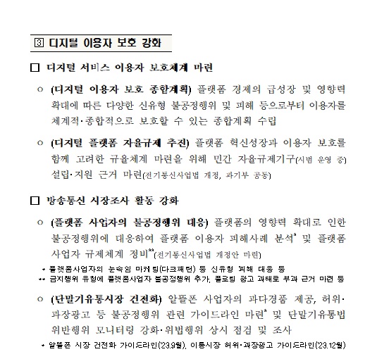 디지털 이용자 보호 종합계획의 경우 플랫폼 경제의 급성장 및 영향력 확대에 따른 다양한 신유형 불공정행위 및 피해 등으로부터 이용자를 체계적‧종합적으로 보호할 수 있는 종합계획을 수립한다는 것이다. 디지털 플랫폼 자율규제 추진은 플랫폼 혁신성장과 이용자 보호를 함께 고려한 규율체계 마련을 위해 민간 자율규제기구(시범 운영 중) 설립‧지원 근거를 마련(전기통신사업법 개정, 과학기술정보통신부 공동)한다는 내용이다.