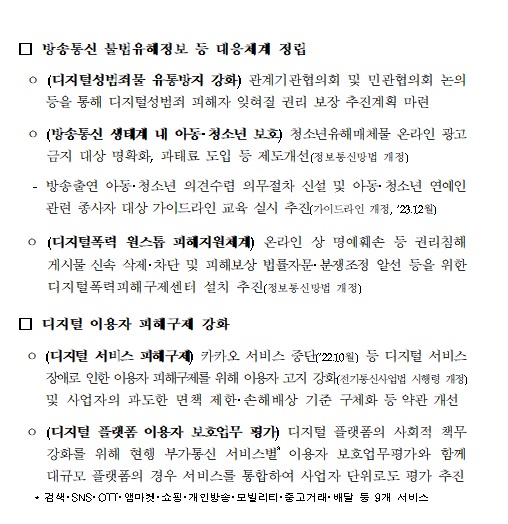 디지털 서비스 피해구제 방안은 카카오 서비스 중단(2022년 10월) 등 디지털 서비스 장애로 인한 이용자 피해구제를 위해 이용자 고지 강화(앞서 설명한 전기통신사업법 시행령 개정) 및 사업자의 과도한 면책 제한‧손해배상 기준 구체화 등 약관을 개선하겠다는 것이다. (관련기사/[단독] 방통위, 플랫폼 이용자 피해구제 강화 방안 내놓는다)