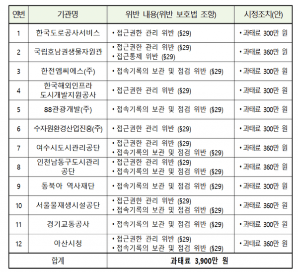 개인정보위는 개인정보 오남용의 근원이 되는 개인정보 처리시스템의 접근권한 관리, 접속기록, 계정 관리 부분을 중점 점검한 결과, 12개 기관이 안전조치 의무(개인정보보호법 29조)를 다하지 않은 사실을 확인했다.