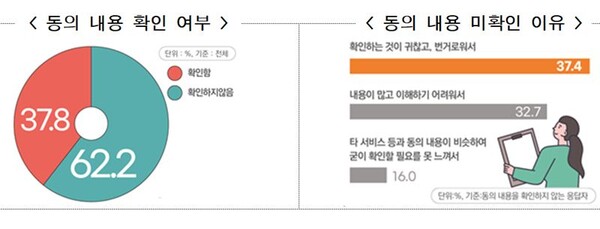 개인정보 제공 시 개인정보 수집·이용·제공 등 처리에 대한 동의 내용을 확인하는 경우는 정보주체의 37.8%에 그쳤다. 나머지 62.2%는 확인하지 않는 것이다. 동의 내용을 확인하지 않는 이유로는 ‘번거로움’(37.4%), ‘내용이 많고 이해하기 어려워서’(32.7%) 등을 거론했다.