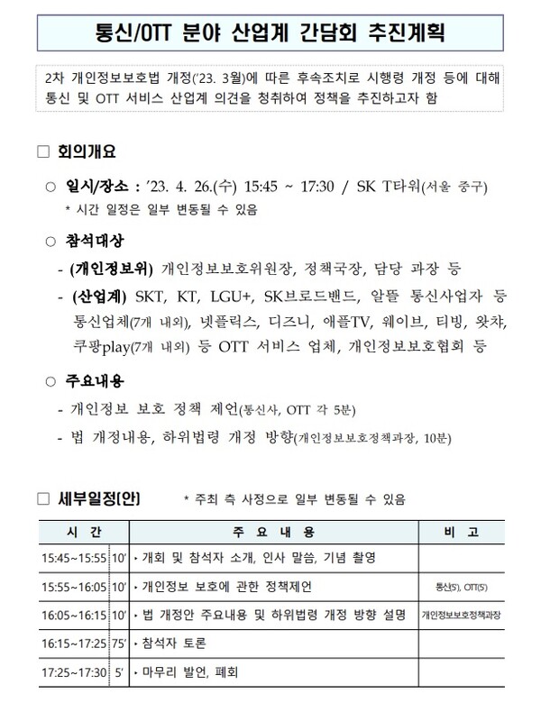간담회 주요 내용은 개인정보 보호 정책 제언과 개인정보법 개정 내용, 하위법령 개정 방향이다. 양청삼 개인정보위 개인정보정책국장과 담당 과장도 같이 참석한다. 고 위원장이 통신3사 및 OTT업계를 만나는 주된 이유는 개인정보법 개정안 시행령 때문으로 풀이된다. 고 위원장이 통신3사를 공식적으로 만나는 것은 취임 이후 처음인 것으로 파악된다.