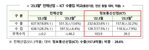 13일 과학기술정보통신부 및 산업통상자원부에 따르면 지난 3월 정보통신기술(ICT) 수출은 157억8000만 달러로 전년 동월 대비 32.2% 감소했다. 글로벌 경기 둔화와 반도체 업황 부진 지속으로 지난해 7월부터 시작된 수출 감소세가 9개월째 이어지는 중이다.