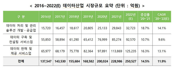 국내 데이터산업 시장규모는 2021년 22조9000만원으로 2020년(20조원) 대비 14.5%(2.9조원↑) 성장했다. 2022년 예상치는 25조1000억원으로 조사됐다. 데이터산업 시장규모는 최근 3년간(2020∼2022) 연평균성장률 11.9%를 나타내며 꾸준한 성장세를 나타냈다.