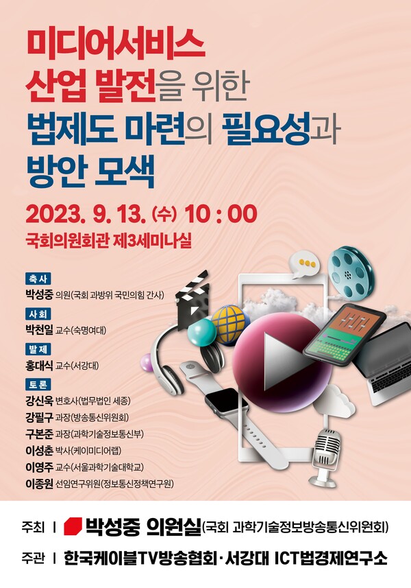 박성중 국민의힘 의원실과 한국케이블TV방송협회(KCTA), 서강대 ICT법경제연구소는 13일 ‘미디어서비스 산업발전을 위한 법제도 마련의 필요성과 방안모색’을 주제로 세미나를 열었다.