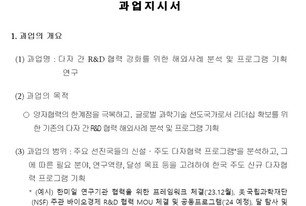과기정통부 관계자는 “정책연구과제로 다자 간 R&D 협력 위한 해외사례 분석 및 프로그램 기획 연구 관련 공고를 낸 것”이라며 “제한 경쟁 방식 입찰로 선정이 되지만 최종 연구 결과를 참조하는 것이지 (연구 결과를 통해) 어떤 정책 방향을 결정하는 것은 아니다”라고 말했다.
