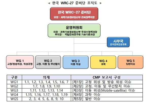이번에 발족한 한국 WRC-27 준비단은 과기정통부를 중심으로 산업계, 학계, 연구계 및 관련 부처(국방부, 국토부, 해수부 등) 관계자 약 60여명(30여개 기관)으로 구성된다. WRC-27 주요 의제 분석과 연구 활동 등을 통해 국제회의에서 국내 전파자원을 확보‧보호하고, 관련 기술의 국제 표준화를 지원하는 것을 목적으로 한다.