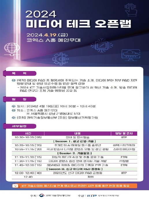 [디지털투데이 백연식 기자] 과학기술정보통신부가 주최하고, 정보통신기획평가원(이하 ‘IITP’)이 주관하는 2024년 제1회 미디어 테크 오픈랩 행사가 19일 오전 서울 코엑스에서 개최됐다.