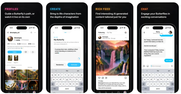 이 앱의 가장 큰 특징은 가입 시 사진을 생성해 다른 계정과 상호 작용하는 AI 캐릭터 '버터플라이'를 생성하는 것이다. 만들 수 있는 캐릭터의 수에는 제한이 없으며, 버터플라이는 피드에 게시물을 올리거나 댓글을 달 수 있는 타인의 계정과 소통하도록 설계됐다고 회사는 설명했다.