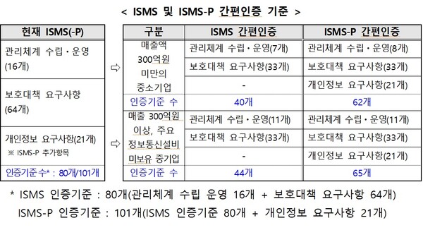 [디지털투데이 백연식 기자] 과학기술정보통신부, 개인정보보호위원회 및 한국인터넷진흥원(이하 ‘KISA’)은 중소기업이 ‘정보보호 및 개인정보보호 관리체계’(이하 ‘ISMS 및 ISMS-P’) 인증 취득 시 부담을 완화하기 위해 ▲인증기준, ▲인증비용 등을 간소화한 ISMS 및 ISMS-P 인증 특례(이하 ‘ISMS 및 ISMS-P 간편인증’) 제도를 24일부터 시행한다고 밝혔다.
