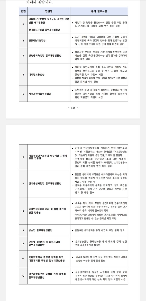 생명공학육성법 일부 개정안의 경우 생명공락 분야의 신기술 개발 추세를 반영해 유망 기술을 집중 육성·활성화하는 법적 근거를 강화하기 위해 통과가 필요하다고 설명했다. 지역과학기술혁신법안은 수도권과 지역 간 격차가 심화되는 상황에서 혁신의 원천인 과학기술을 통해 지역의 활력을 회복하기 위해 지원근거 마련이 시급하다는 입장이다.