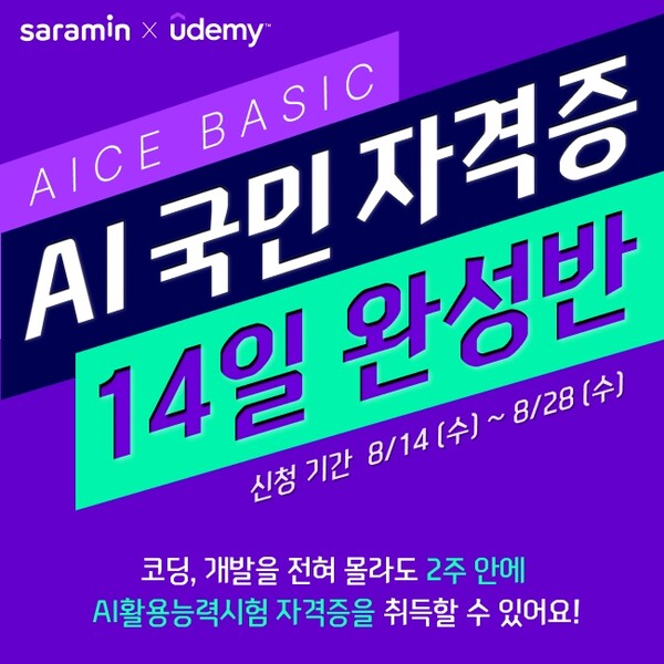[디지털투데이 황치규 기자]커리어 플랫폼 사람인은 인공지능(AI) 활용 능력 검증시험 AICE(AI Certificate for Everyone) 합격을 위한 ‘AI 국민 자격증 14일 완성반’ 클래스를 판매한다고 20일 밝혔다.