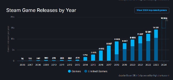 26일(현지시간) 온라인 매체 기가진에 따르면 스팀에서 2024년 새로 출시된 게임 타이틀 수는 1만8864개로, 지난해 1만4311개를 크게 웃돌아 역대 최고치를 기록했다.