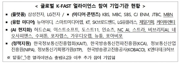 지난 4월 출범한 얼라이언스는 K-FAST 글로벌화 및 국내 미디어·콘텐츠 산업 경쟁력 강화를 위한 민·관 협업 구심점 역할을 한다. 출범 당시 22개 기업·기관으로 시작한 얼라이언스는 이후 AI 미디어·콘텐츠 현지화 기술 기업 등 12개사가 추가 참여해 총 24개 기업·기관으로 확대됐다.
