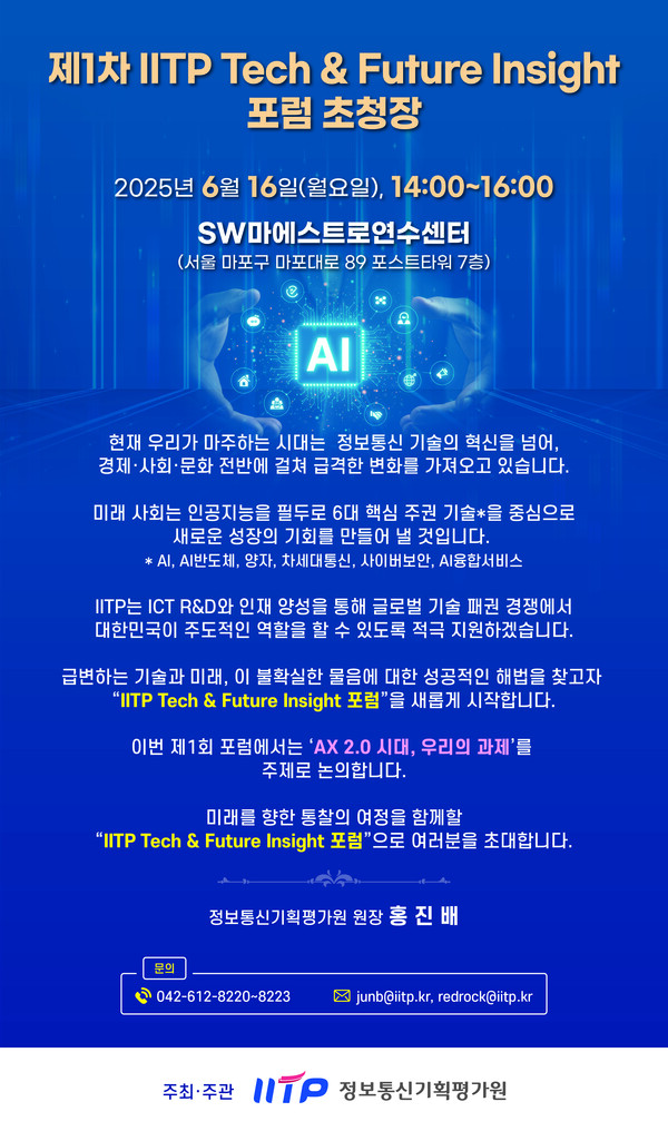 홍진배 IITP 원장은 "이번 행사는 AX시대 기술 동향과 미래 조망을 공유하고, 대응을 위한 인사이트를 모으는 자리가 될 것"이라고 밝혔다.