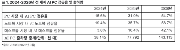 IT 전문 시장 분석 업체 가트너에 따르면 2025년 전 세계 AI PC 출하량이 전년 대비 약 104% 증가해 전체 PC 시장에서 31%를 차지할 것으로 전망된다. 2026년에는 AI PC 출하량이 1억4300만 대로 전체 PC 시장 55%를 차지할 것으로 예측됐다.